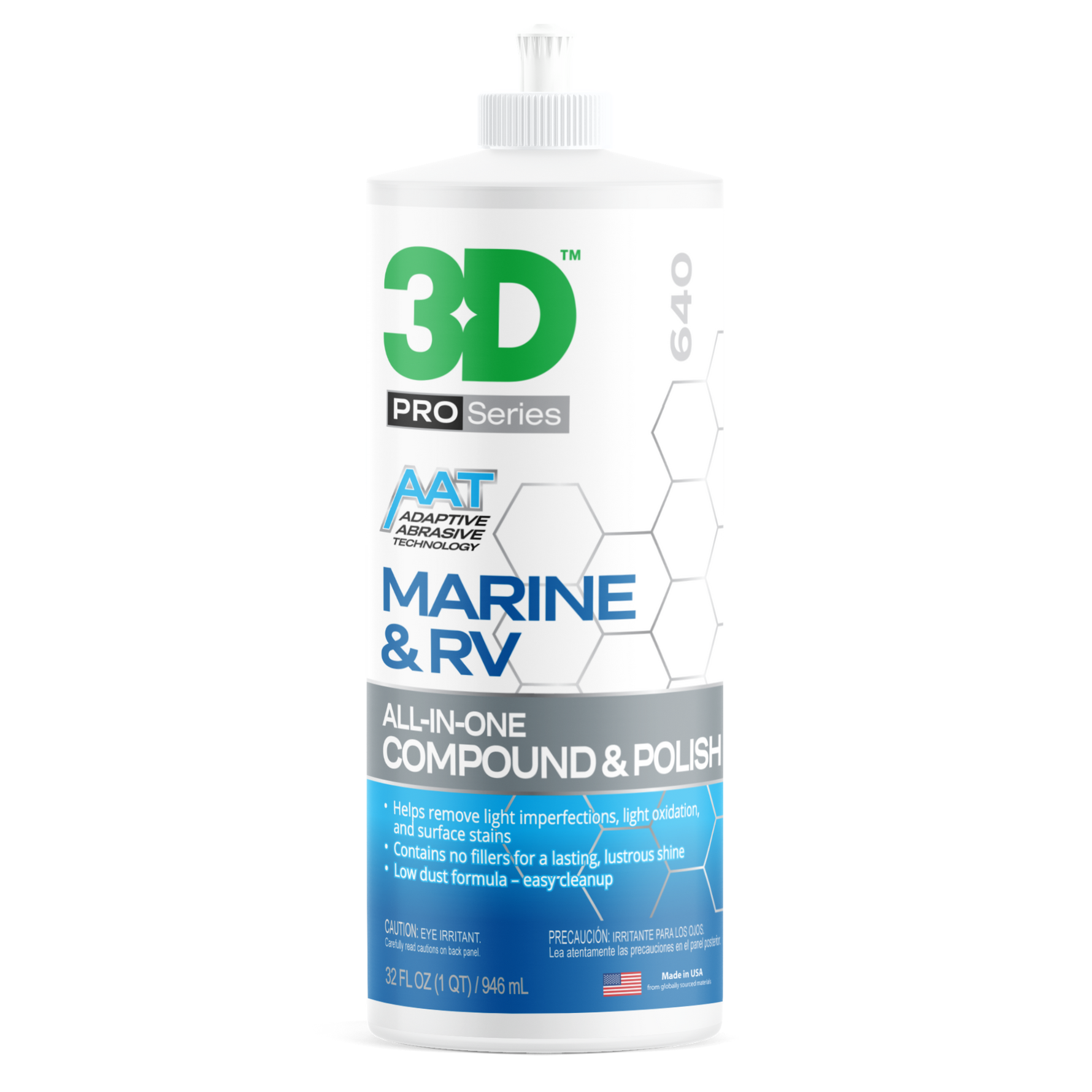 3D Marine & RV All-In-One Compound & Polish is formulated with our Adaptive Abrasive Technology that maximizes cut rate up to 2000P sand marks while providing and incredible deep shine to gel coat surfaces. You can cut and finish with one product by simply changing pads - wool or foam (cutting to finishing). Its filler-free formula provides true gel coat correction.