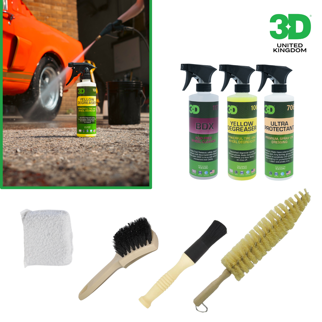 This 3D Car Care UK Wheel Cleaning & Care Kit from 3D Products Hi Tech Industries is the ultimate solution for maintaining your wheels and tires.